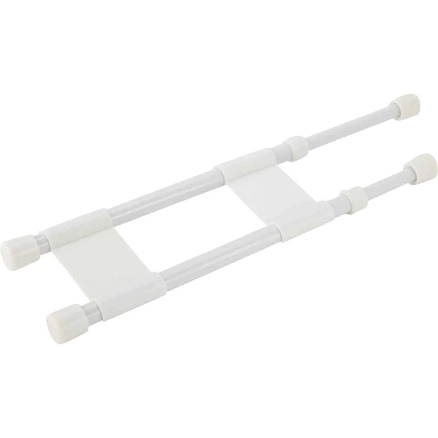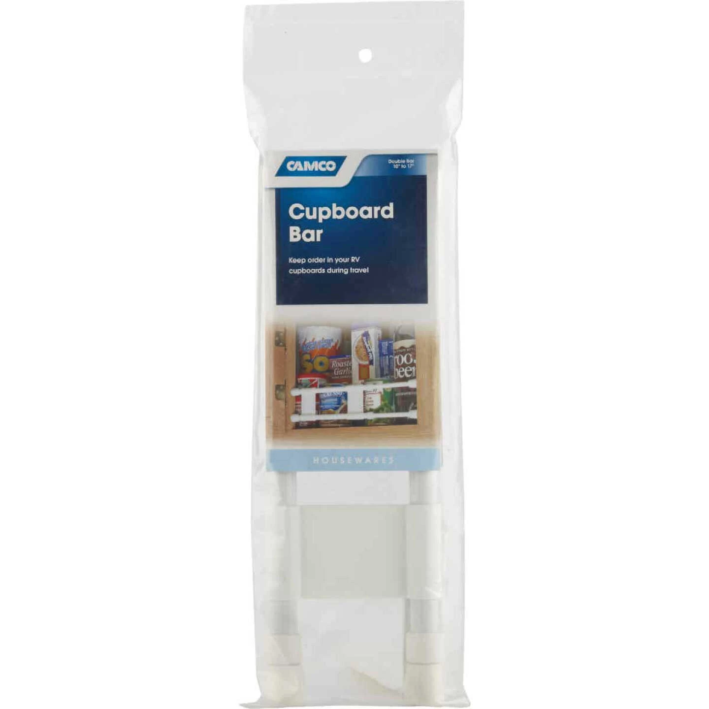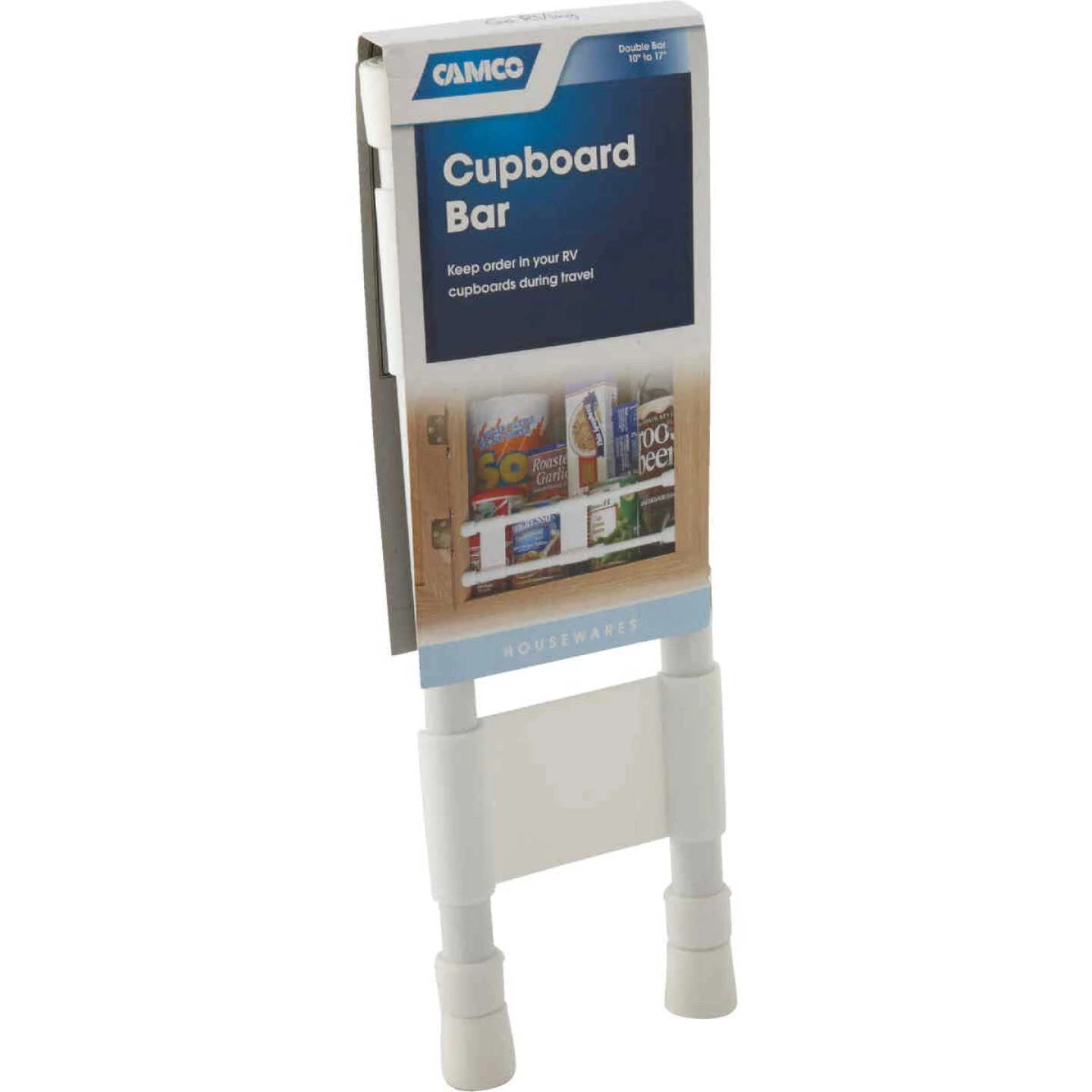 Spring-loaded double storage bars keep items in place during RV travel. White