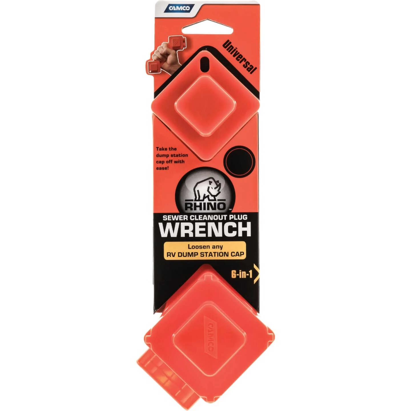 Universal 6-in-1 tool will loosen any dump station cap with ease. Works with slotted or flush sewer plugs. Works with 3 In. and 4 In. male and female sewer plugs. Easy grip handle. Also works with any Camco 4-in-1 adapter.